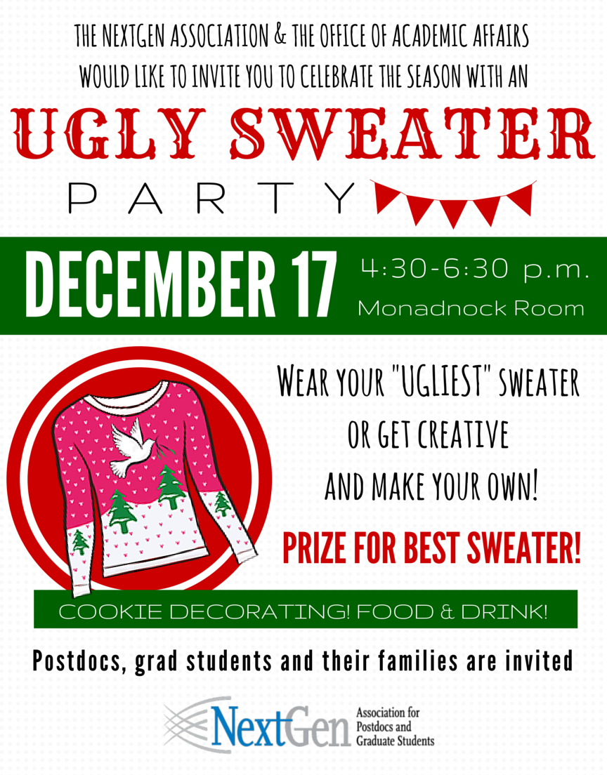 The NextGen Association and the Office of Academic Affairs would like to invite you to celebrate the season with a special monthly social: UGLY SWEATER PARTY! Wednesday, December 17, 4:30-6:30 p.m. in the Monadnock Room.