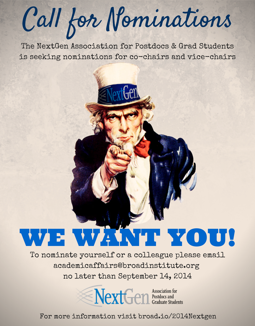 Have you ever wondered what the NextGen Association is or how you can get involved? Do you really wish Broad offered a particular program for trainees? Do you want to meet new people? Feel free to drop by, grab some lunch, and meet with your peers.