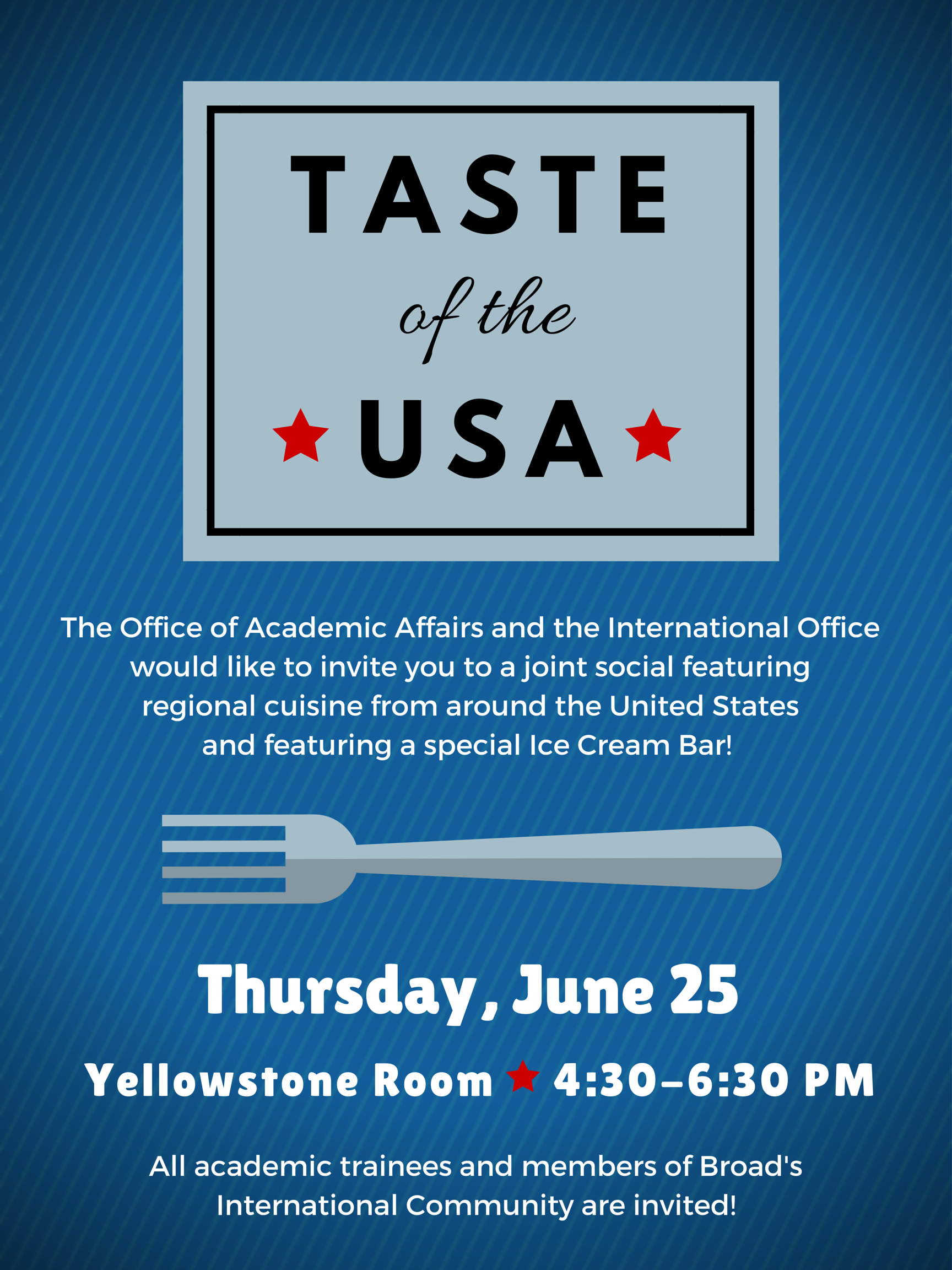 This month we are joining the International Office for a special joint social featuring cuisine from around the USA and a special Ice Cream bar staffed by members of Broad’s International Office!