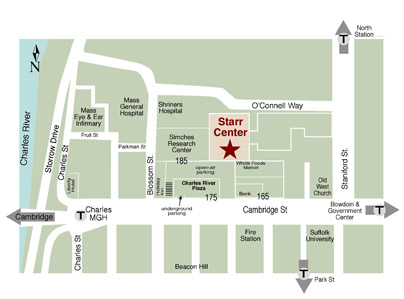 The closest Green Line station is Park Street. (You may change to the Red Line at Park Street and continue along to Charles Street station, which is just slightly closer than Park Street, and follow the directions above.) Walk up Park Street toward the Massachusetts State House on Beacon Street, turn left on Bowdoin Street and walk down the hill to Cambridge Street, towards the Holiday Inn. Staniford Street is on the right, and just beyond is Charles River Plaza, also on your right.